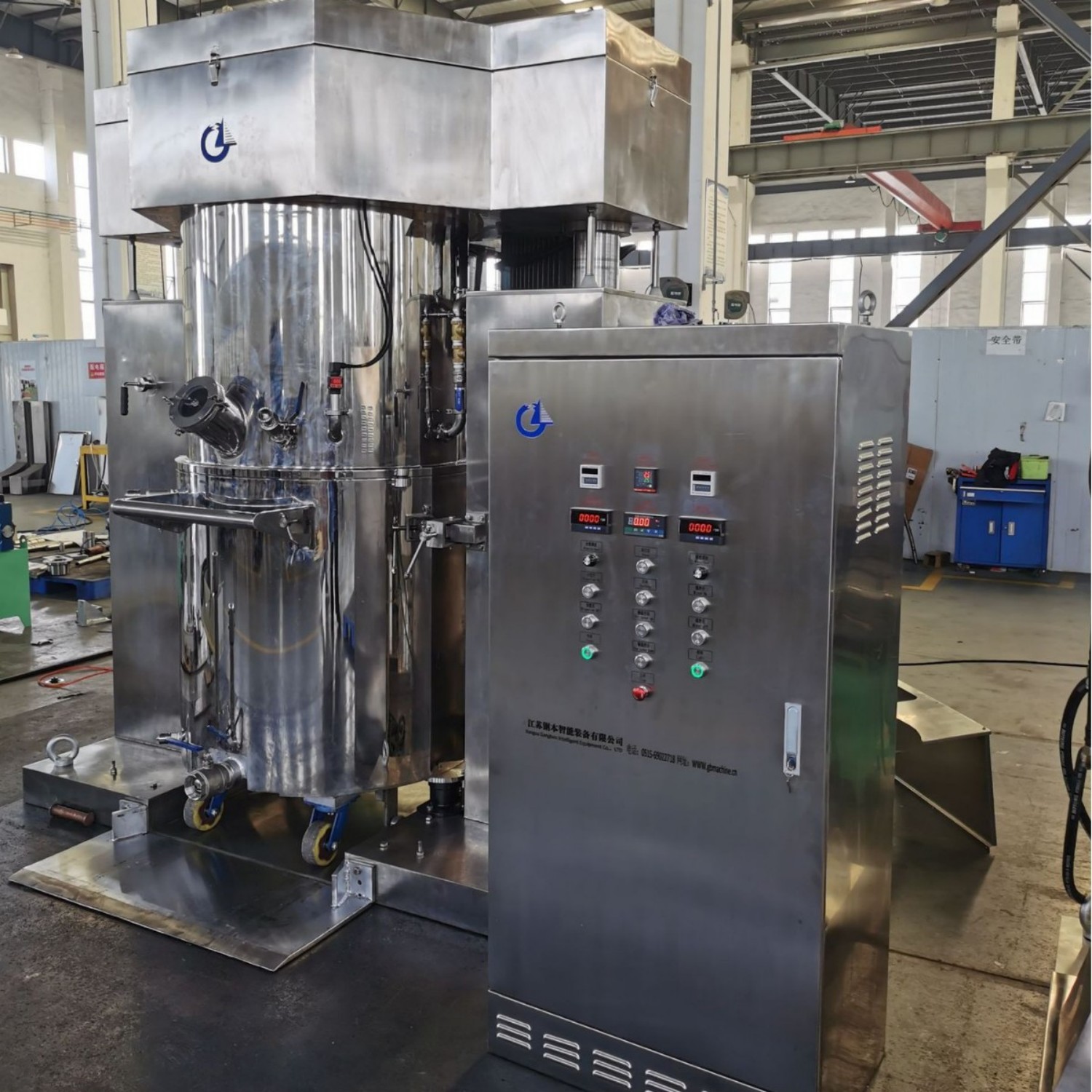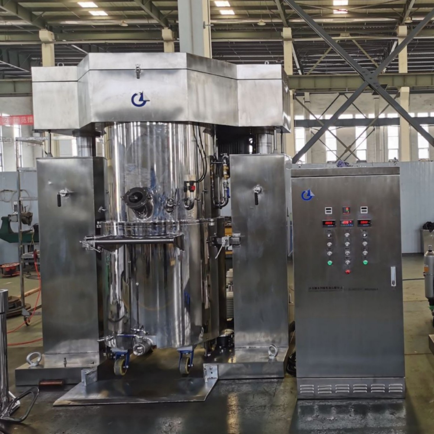O misturador dispersor planetário duplo 500L é uma solução de nível industrial para mistura de materiais de alta viscosidade em larga escala. Seus agitadores planetários duplos e discos de dispersão de alta velocidade garantem uma mistura uniforme e sem ângulo morto. Equipado com um sistema de vácuo opcional, elimina bolhas e oxidação, ideal para adesivos, compósitos e revestimentos. Feito de aço inoxidável 304/316L, possui controle de velocidade contínuo, uma tela sensível ao toque fácil de usar e intertravamentos de segurança. Com construção robusta e desempenho eficiente, atende às demandas de produção em massa nos setores químico, de novos materiais e de manufatura.
